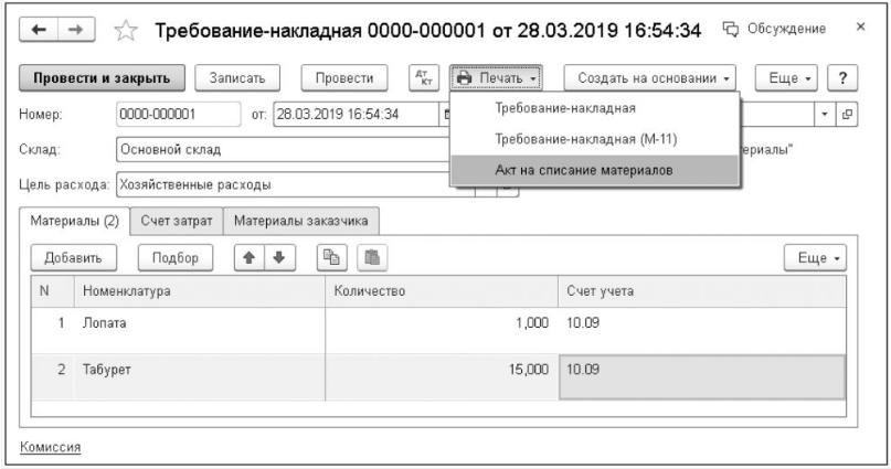Акт на списание материалов в 1С