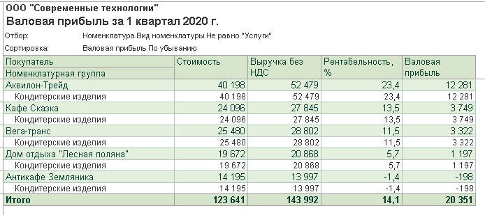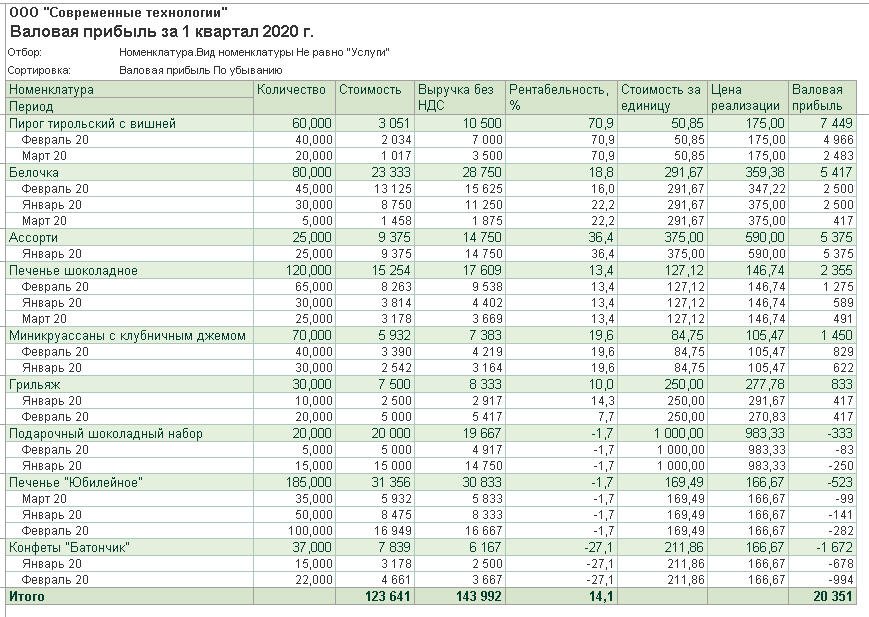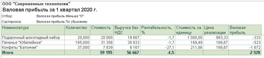 Если использовать отчет по умолчанию, первыми будут выведены товары, которые реализованы с максимальной валовой прибылью.
