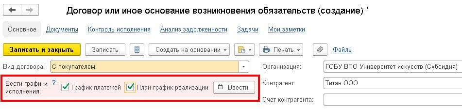1. В карточке договора требуется поставить флаг "Вести графики исполнения – График платежей".