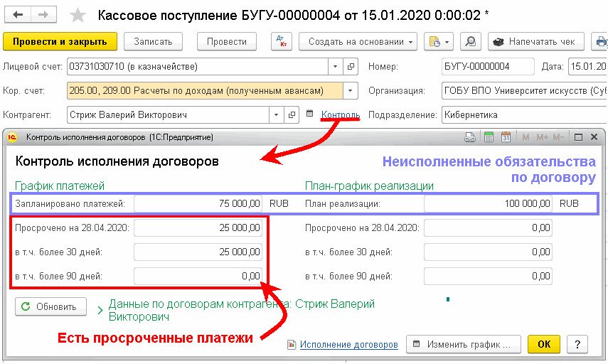 К примеру, из карточки договора об оказании платных образовательных услуг с графиком оплаты, который заключается в четырех платежах по 25 тысяч рублей каждый в январе, марте, августе и октябре текущего года, получится быстро получить сведения о процессе выполнения договора - то есть, плана по доходам.