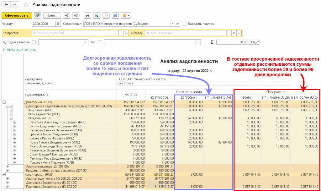 Так, значительная часть задолженности организации, отображенной на счетах 205.00 «Расчеты по доходам», может являться долгосрочной, следовательно быстро попросить у дебиторов и превратить в деньги всю сумму задолженности по сведениям бух. учета гос. учреждения нельзя. ФСБУ "Представление бухгалтерской (финансовой) отчетности" и установленные виды отчетности предусматривают раскрытие показателей по долгосрочной и просроченной задолженности.