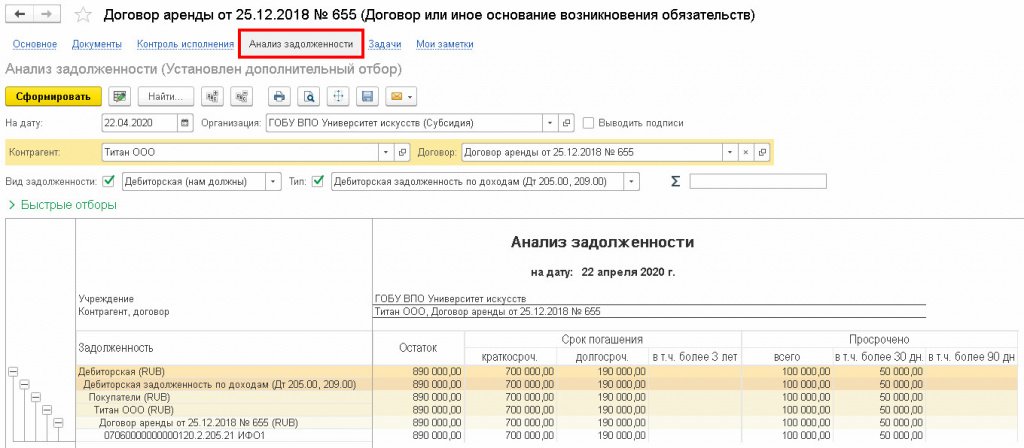 Для осуществления анализа задолженности по какому-либо договору с дебитором отчет «Анализ задолженности» довольно просто составлять, находясь в самой карточке договора.