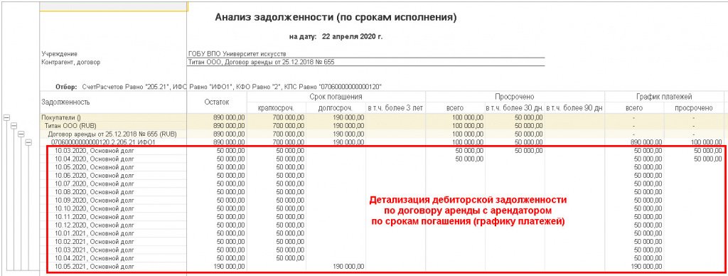 При двойном нажатии на строке отчета «Анализ задолженности» составляется расшифровка с детализацией дебиторской задолженности по периодам погашения - по датам, взятым из графика платежей по арендному договору.