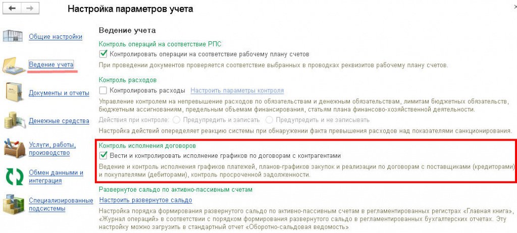 Описанные в этой статье опциональные возможности подключаются в настройках характеристик ведения учета (в категории Администрирование – Настройка параметров учета – Ведение учета) при помощи флага Вести и контролировать исполнение графиков по договорам с контрагентами.