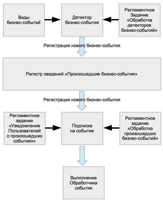 Бизнес-событие представляет из себя некий важный факт, событие, которое необходимо подтвердить изменением сведений в информационной базе. Причём к ним есть возможность привязки особых обработчик, с помощью которых можно реализовать различные механизмы.