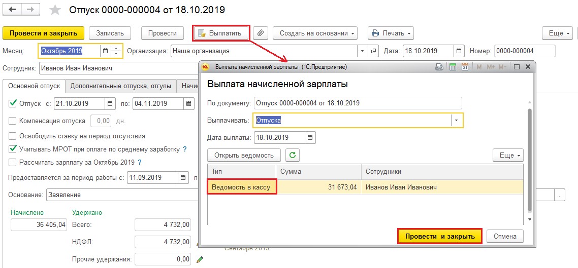 После того как документ будет проведен, нам будет нужно сделать выплату начисленных отпускных дней, нажимаем для этого кнопку «Выплатить».