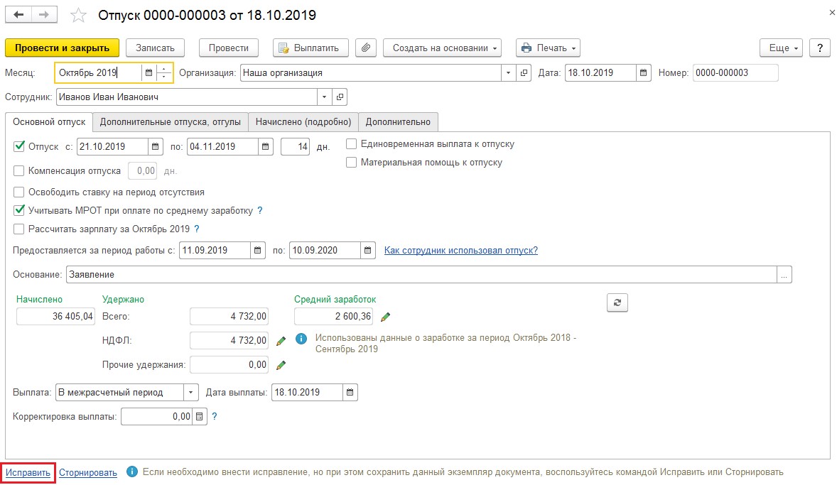 • Если больничный, отпуск и продление отпуска выпадает на один расчётный период, заходим в первоначальный документ «Отпуск» и в левом нижнем углу данного документа нажимаем на ссылку «Исправить».