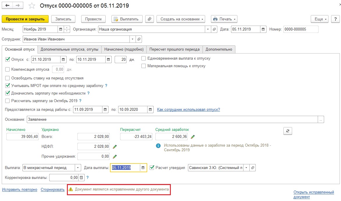 Заходим в первоначальный документ «Отпуск» и нажимаем на «Исправить». В новом документе нужно будет указать совершенно новый период начисления (то есть, ноябрь). Внесём изменения в дату конца отпуска, при этом увеличив её на необходимое нам количество дней. И учитывая тот факт, что мы уже ввели больничный лист, в котором уже произошло исправление дней пересечения, программа сразу же и автоматически произведёт пересчёт отпускных начислений.