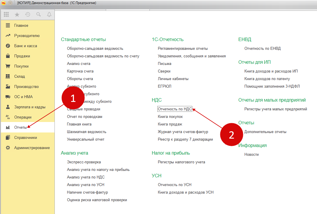 Для заполнения самой декларации необходимо зайти в раздел "Отчеты" и далее в "Отчетность по НДС".
