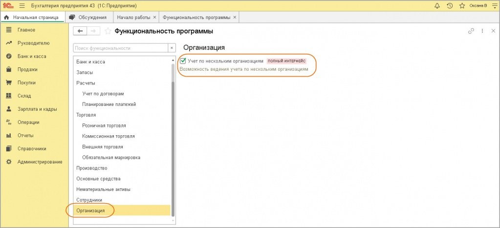 Для этого надо поставить флажок «Учет по нескольким организациям» в блоке «Организации» в настройках функциональности 1С. Пользователь заходит в «Главное», затем «Функциональность» или через «Администрирование» и далее в «Функциональность».