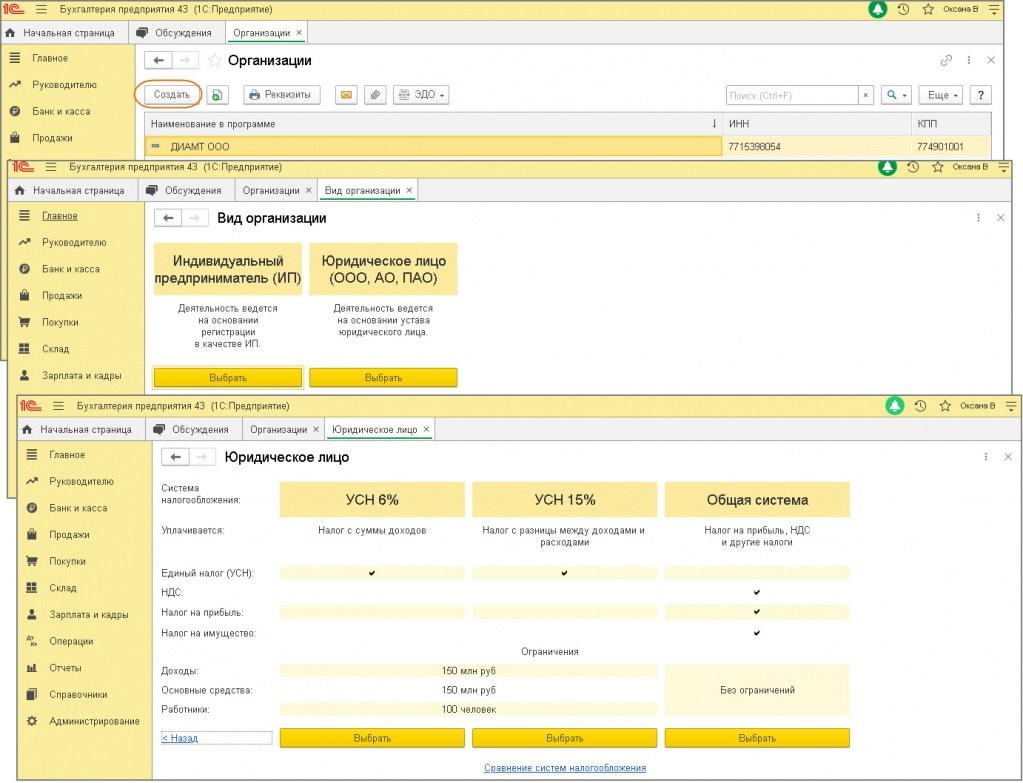 В справочник «Организации» нужно включить новую компанию или ИП. Пользователь заходит в «Главное», потом в «Функциональность». Там он нажимает на кнопку «Создать», выбирает субъекта (юрлицо или ИП) и режим налогообложения.