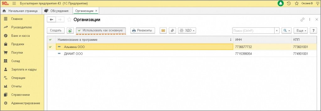 При ведении в одной информационной базе учета по нескольким хозяйствующим субъектам целесообразно одного из них выбрать основным, чтобы было удобнее. Для этого предназначена кнопка «Использовать как основную».