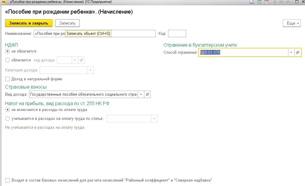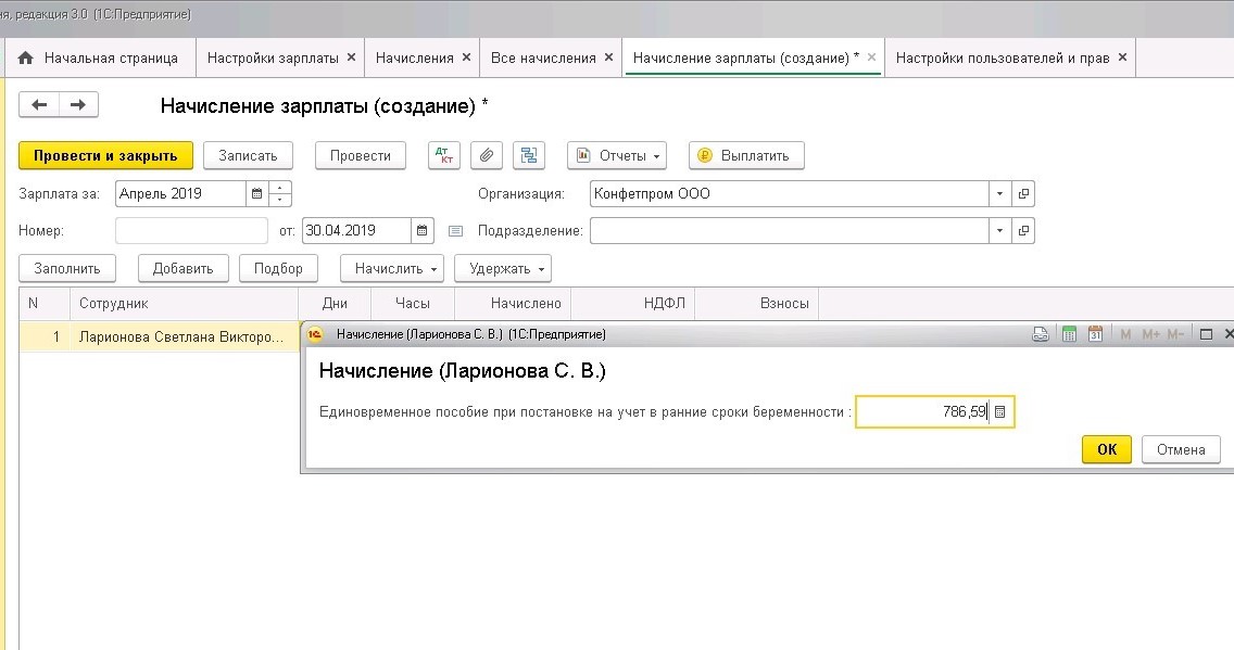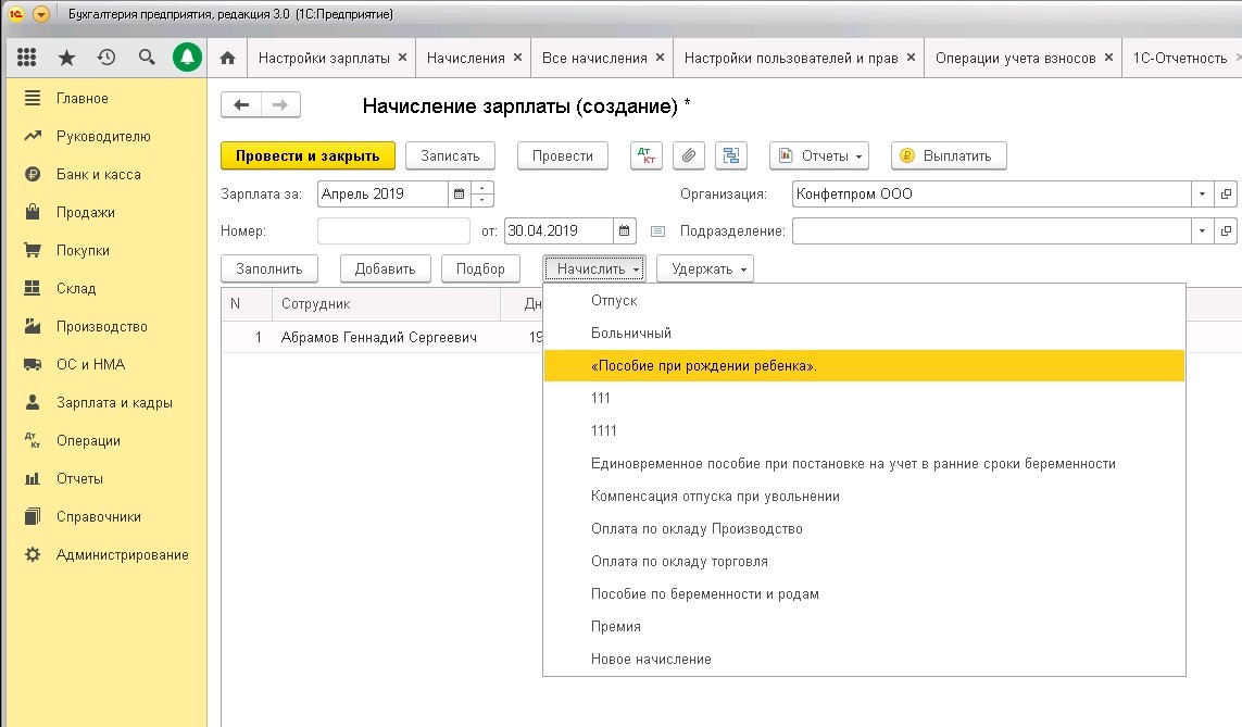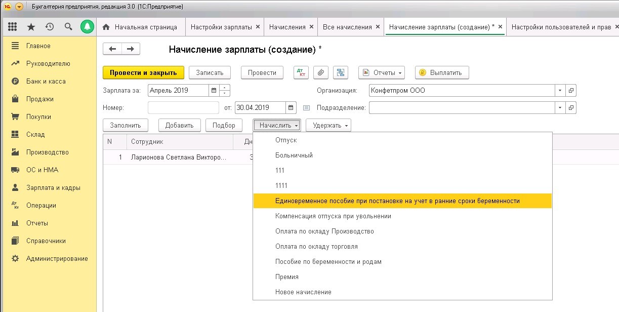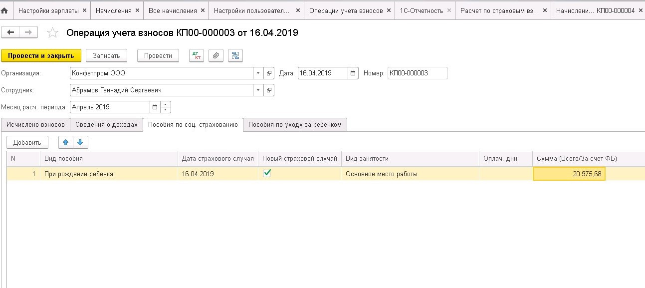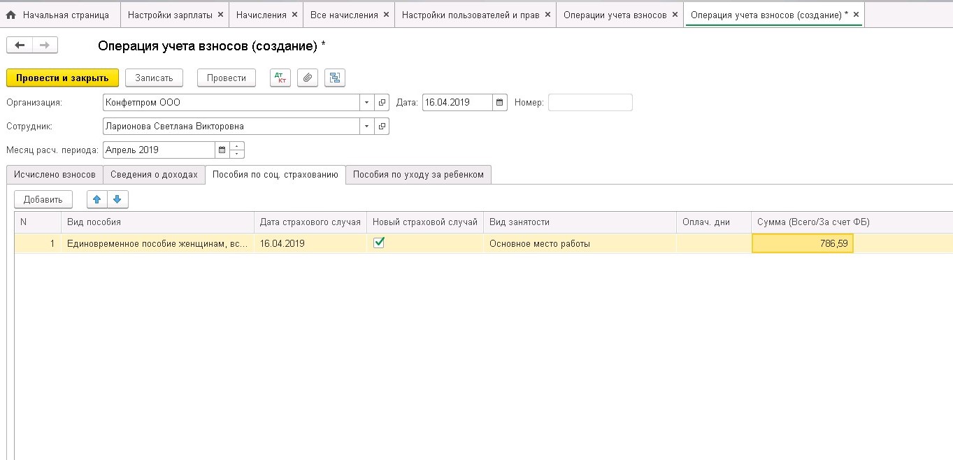 - Вносим данные и завершаем работу в данном разделе. назначить пособие нужного нам типа можно, используя документ «Начисление зарплаты».