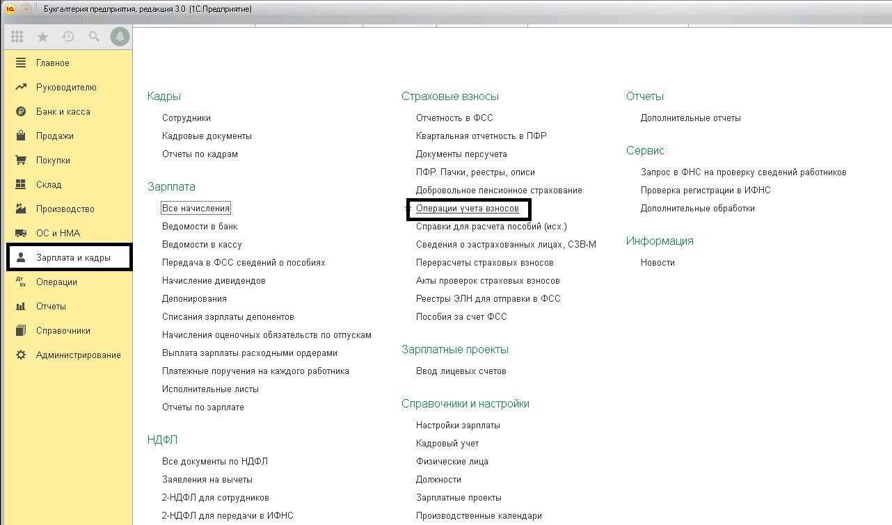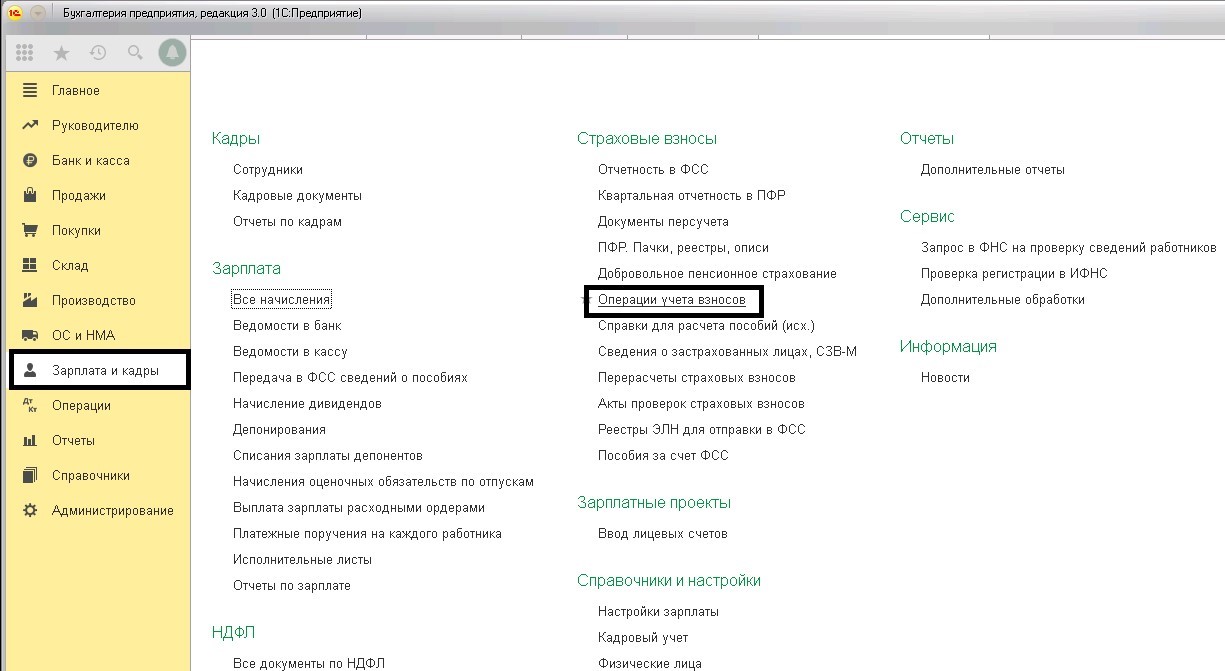 Для того чтобы в регламентированной отчетности появились данные о выплате, оформляем документ «Операция учета взносов».
