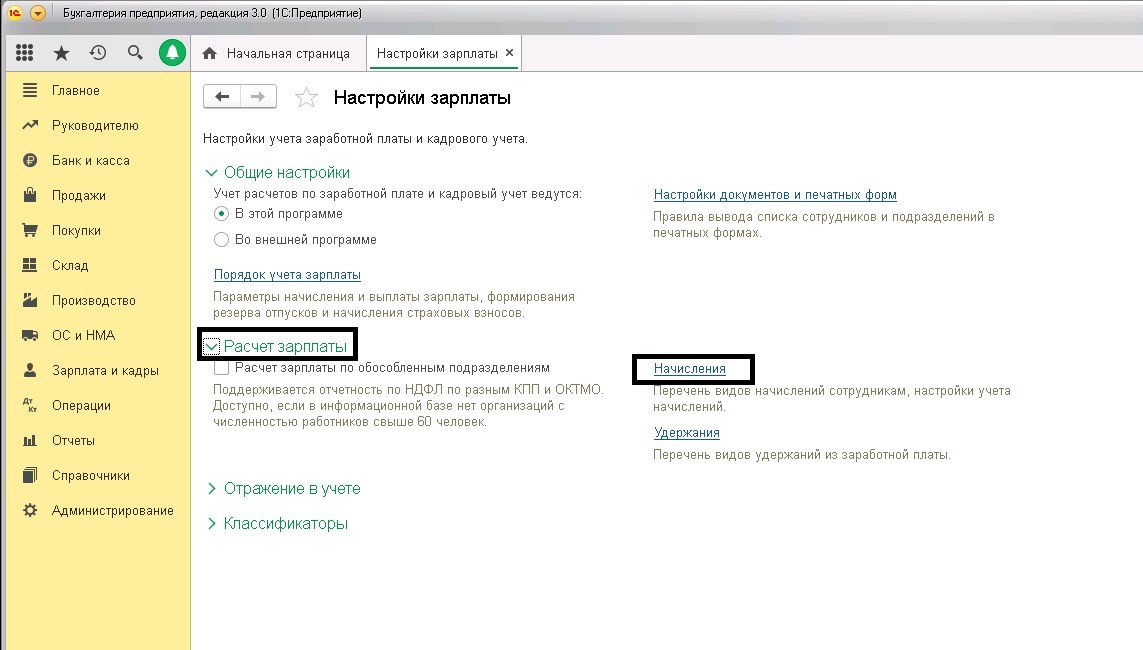 - Ищем подраздел «Настройка зарплаты», расположенный в меню «Зарплата и кадры».