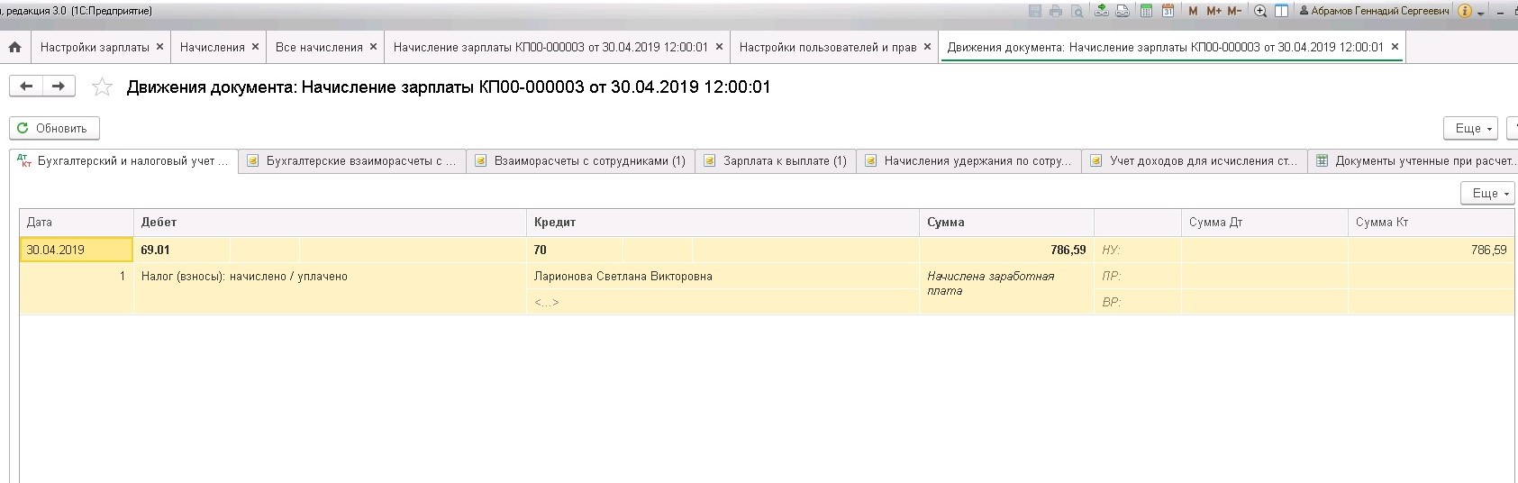 - Формируем документ «Начисление зарплаты», вносим информацию о работнике, для которого предназначена выплата.