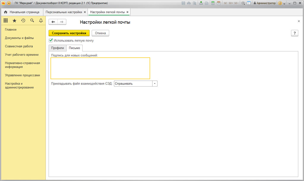 Однако ограниченный функционал не мешает ей занимать важное место в выполнении системных задач, в частности в отправке и получении почтовых сообщений. Еще одним отличием от встроенной почты является то, что легкая почта не сохраняет в системе сообщения и вложения. Таким образом, это позволяет существенно сэкономить на объеме базы данных. Все почтовые сообщения (входящие, исходящие) могут храниться на почтовом сервере. Кроме того, функционал программы позволяет создавать из входящих писем самостоятельные документы. Это позволяет обеспечить сохранность всей получаемой информации.