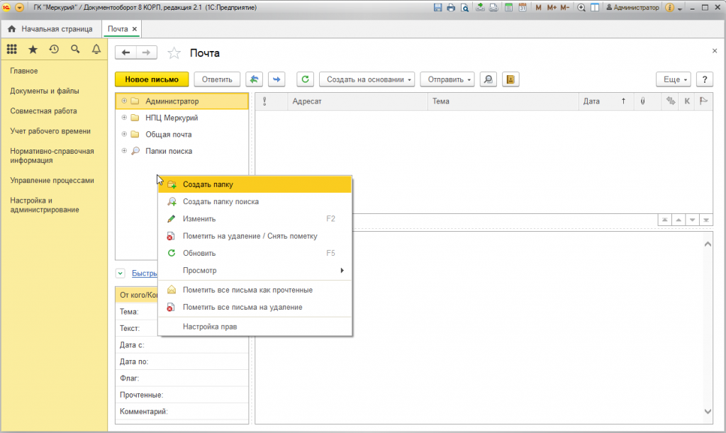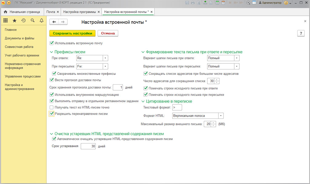 Настройка встроенной почты в 1С:Документооборот 8 КОРП
