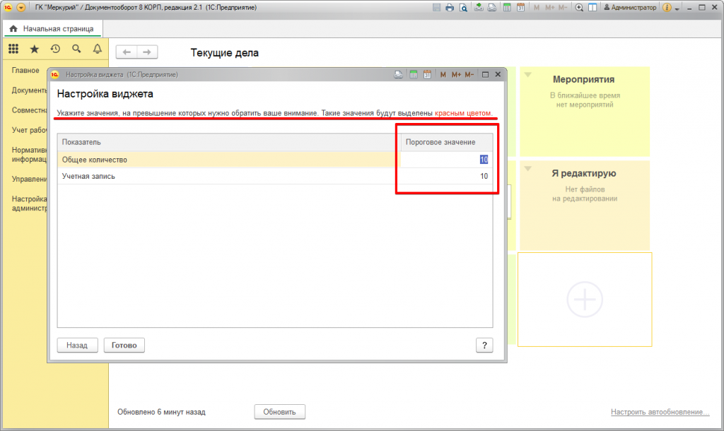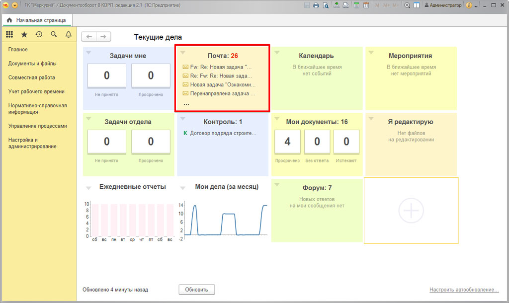 Учетная запись, которая позволяет выполнять рассылку уведомлений и обеспечивает работу прочего функционала (например, опция «Выполнение задач по почте»), работает только на базе легкой почты. Для того, чтобы настроить свою учетную запись, необходимо на начальной странице в разделе «Настройка и администрирование» открыть пункт «Учетные записи».