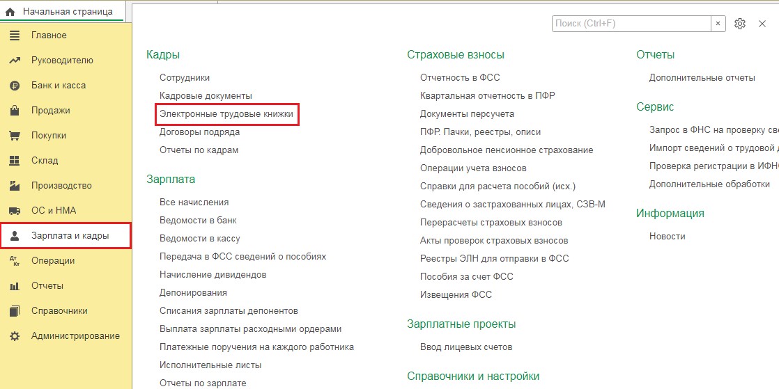 Контролируем заполнение отчетной формы СЗВ-ТД, для этого откроем раздел «Зарплата и кадры» и выбираем строку «Электронные трудовые книжки».