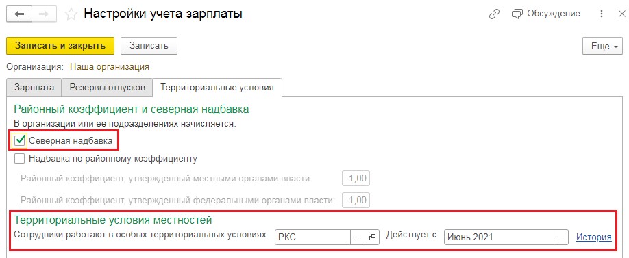 Чтобы изменить параметры территориальных условий, нужно отметить значок «Северная надбавка» затем в строке «Сотрудники работают в особых территориальных условиях» определяем необходимое значение, например, РКС – Район Крайнего Севера и отмечаем дату, с которой эти изменения вступают в силу. Чтобы сохранить результат, нажмем «Записать и закрыть».