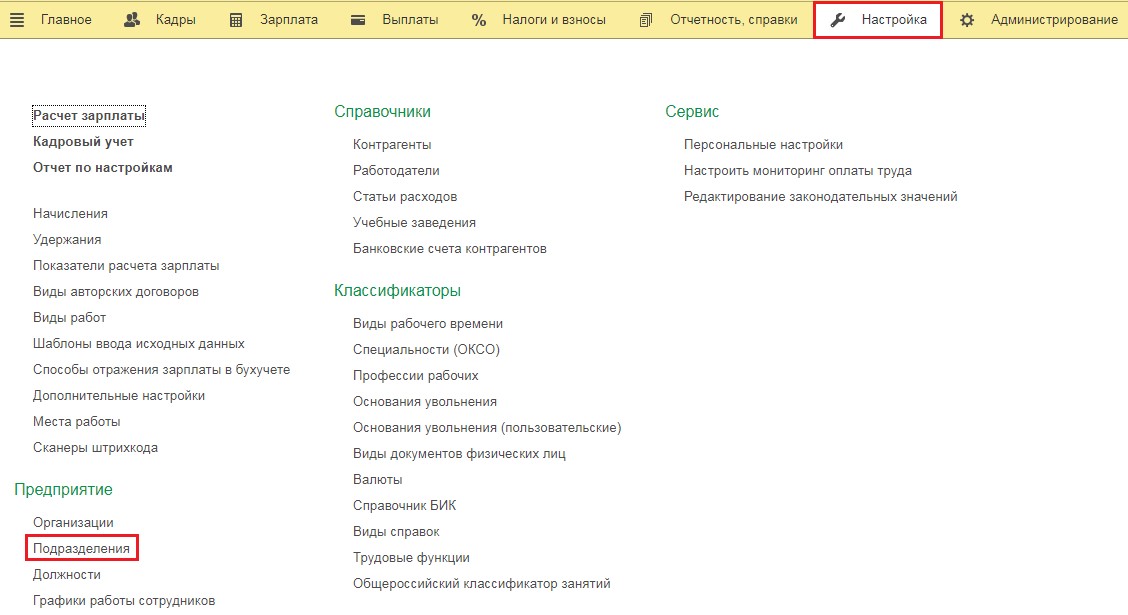 Чтобы редактировать существующие территориальные условия, необходимо зайти в настройки и открыть пункт «Подразделения».