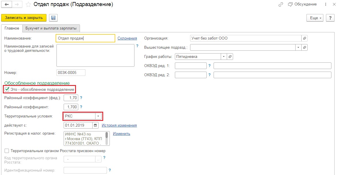 В появившемся окне двойным кликом находим нужное подразделение, ставим галочку «Это обособленное подразделение» и отмечаем нужные территориальные условия и дату начала действия изменений. Далее сохраняем все сделанное кнопкой «Записать и закрыть»