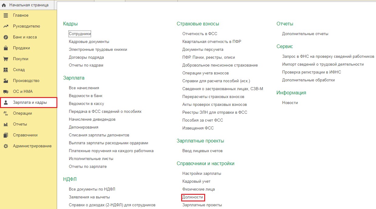 В программе 1С: Бухгалтерия предприятия код выполняемой функции надлежит заполнять в справочнике «Должности» раздела «Зарплата и кадры».