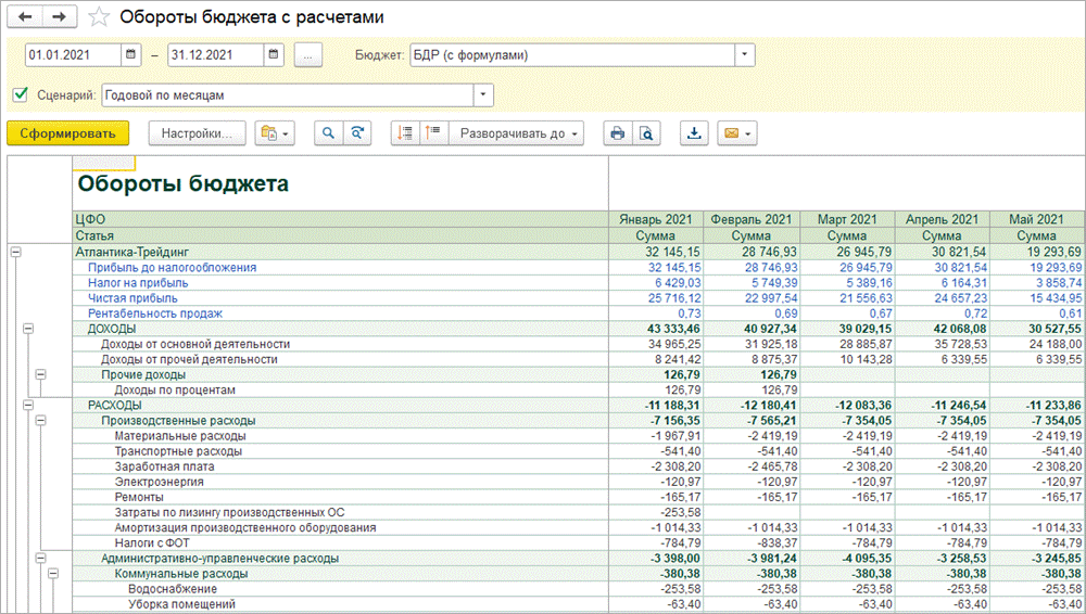 Для отслеживания динамики ФОТ используется отчет «Обороты бюджета», который показывает обороты по статьям бюджета за выбранный период в разрезе аналитик бюджетирования, включая ФОТ. В отчете можно настраивать детализацию по статьям, периодам и аналитикам, что позволяет анализировать динамику расходов на персонал и принимать управленческие решения.