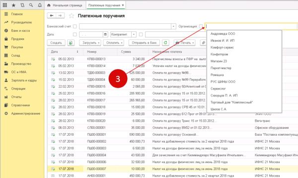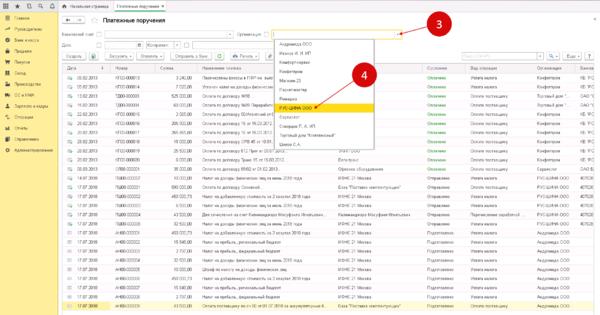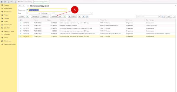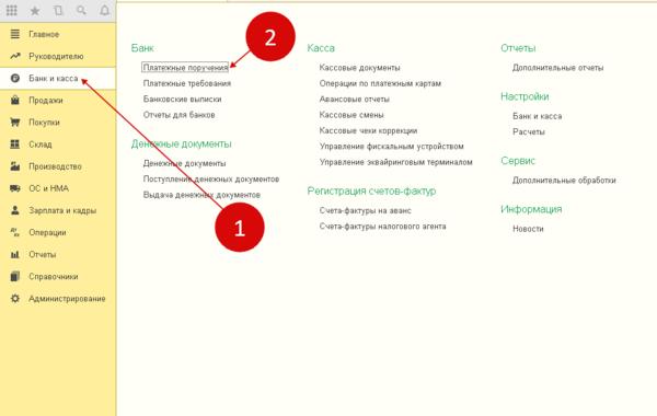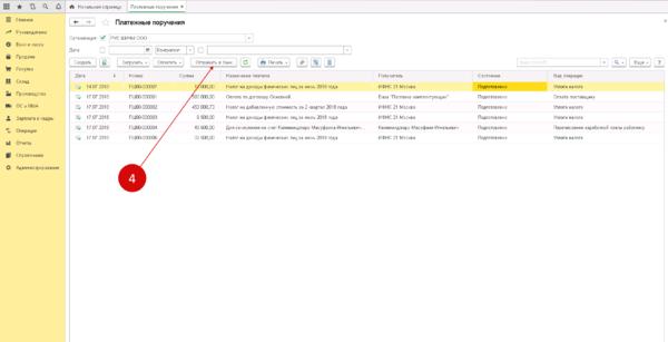 Для начала необходимо зайти в левой панели в  раздел «Банк и касса», выбрать «Платежные поручения» . Будут видны все созданные до этого платежки.