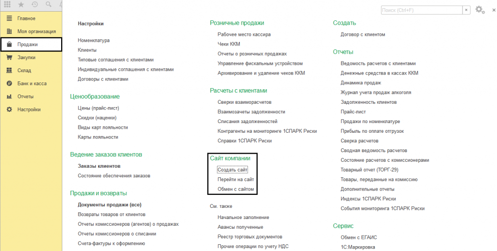 Чтобы выполнить настройку обмена данных с сайтом, необходимо перейти в пункт «Обмен с сайтом». Он находится в разделе меню «Продажи» –> «Сайт компании».
