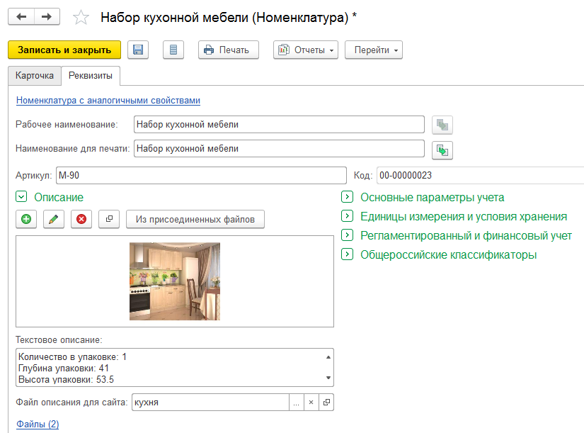 Теперь следует перейти в закладку «Реквизиты», которая находится в карточке номенклатуры. Здесь можно добавить описание и медиафайлы в виде фотографий. Поле «Файл описания для сайта» предназначено для добавления файлов, которые будут добавлены в раздел «Описание». Для этого необходимо нажать «Из присоединенных файлов».