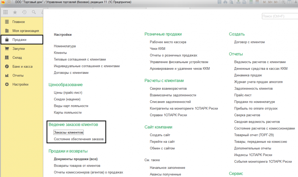 Теперь следует выбрать «Выполнить обмен», а затем проверить состояние заказа в 1С. Для этого необходимо перейти в меню «Продажи» –> «Ведение заказов клиентов».