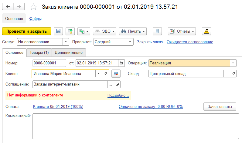В журнале «Заказы клиентов» будет отображаться сформированный ранее заказ в интернет-магазине.