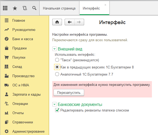Здесь необходимо будет выбрать нужный вариант. Можно изменить интерфейс вашей системы 1С на такой, как версиях 8.3 или выбрать аналогичный Бухгалтерии редакции 7.7.