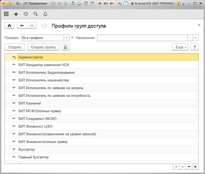 Такой подход позволяет сразу задать типовые роли: финансист, исполнитель, специалист по закупкам, сотрудник МСФО и другие. Пользователь получает нужный набор прав через назначение профиля, без ручной настройки каждого действия.