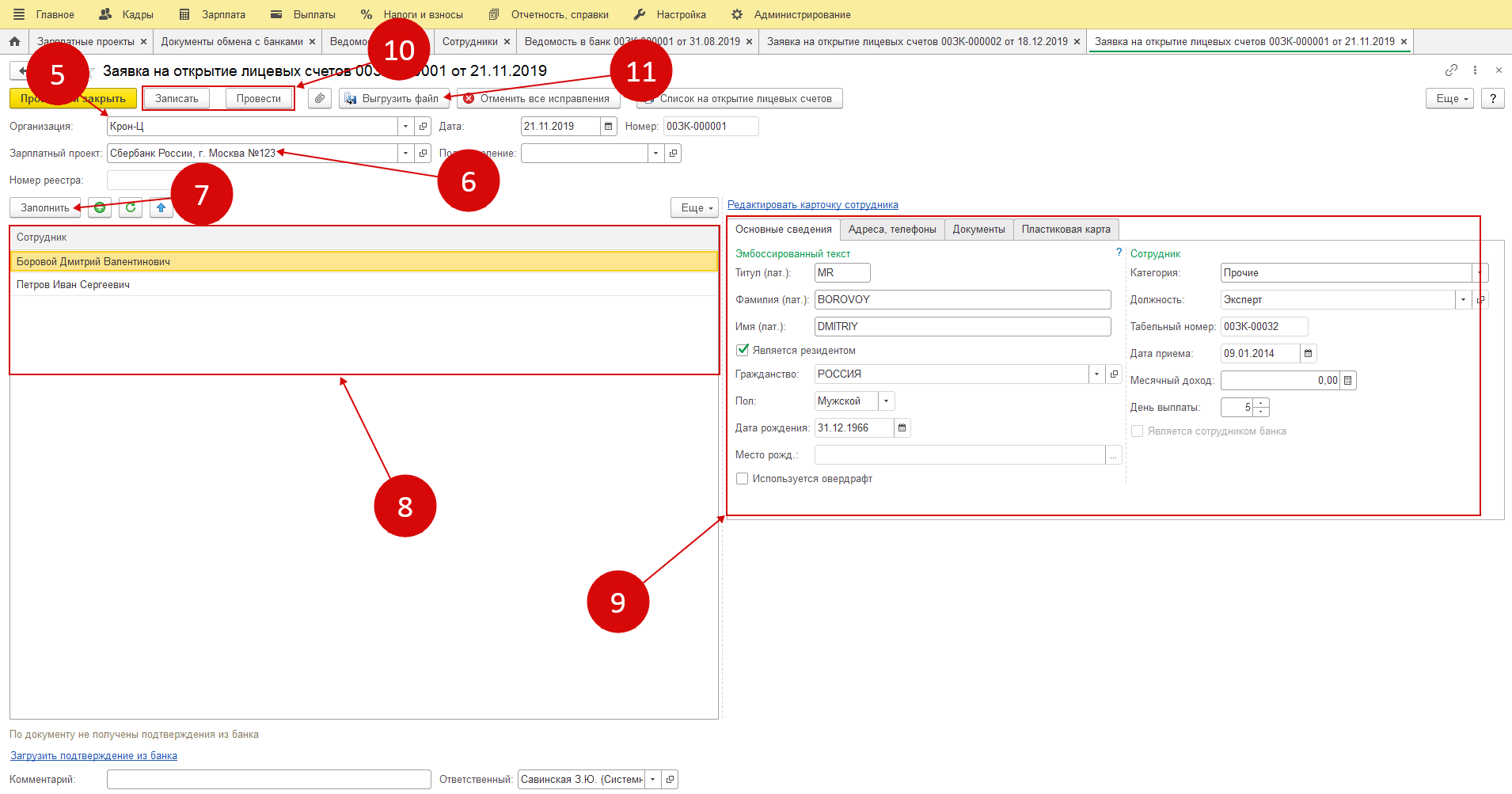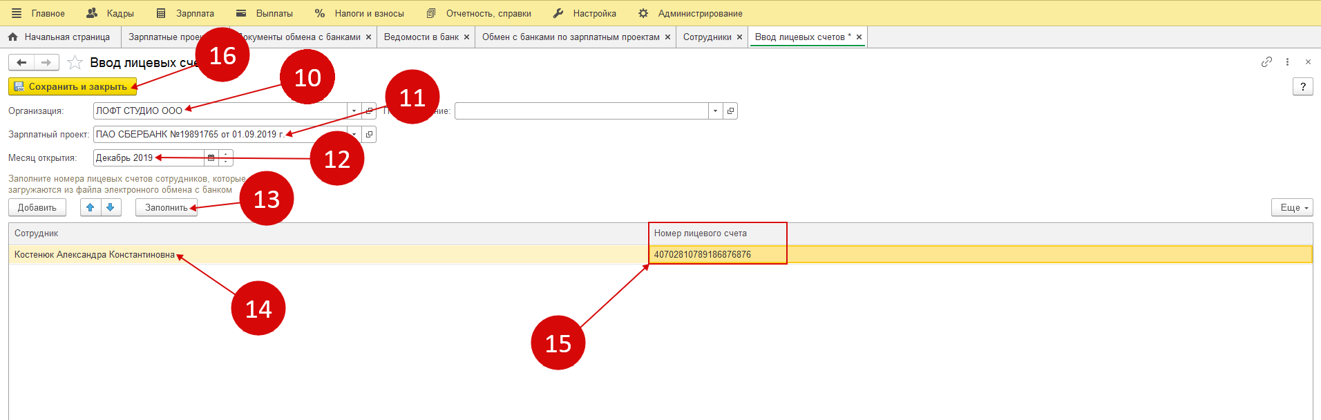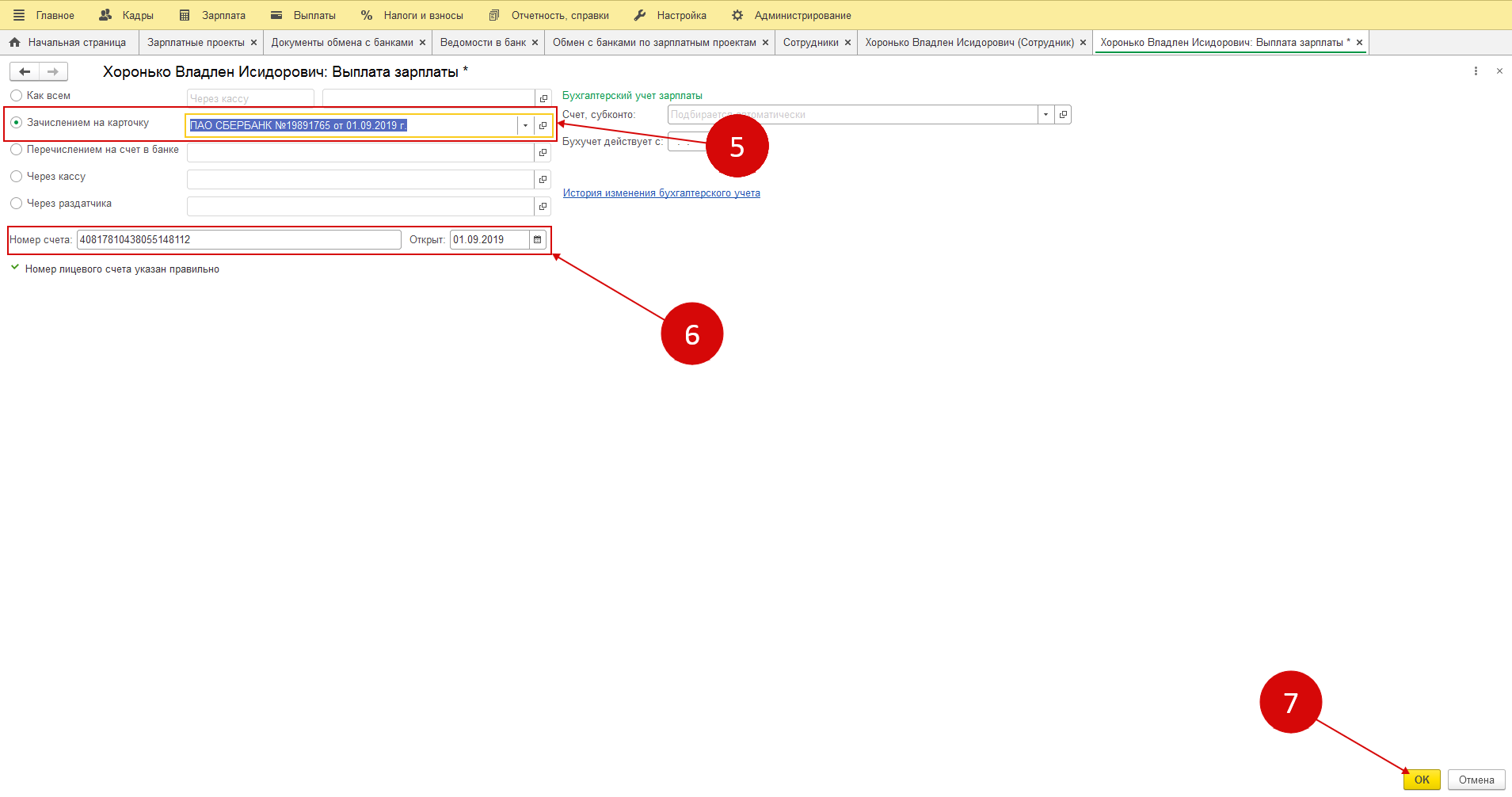 Как только будут выполнены данные манипуляция, сведения о лицевом счете каждого сотрудника появятся в их личных карточках.
