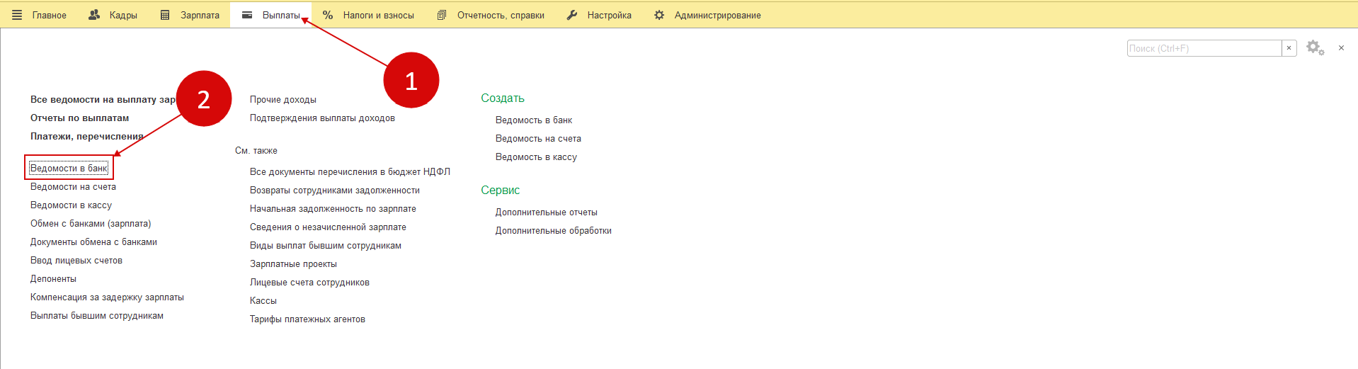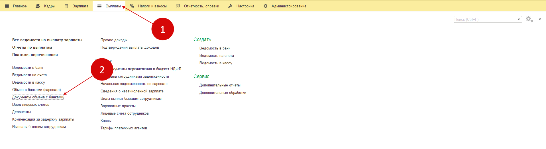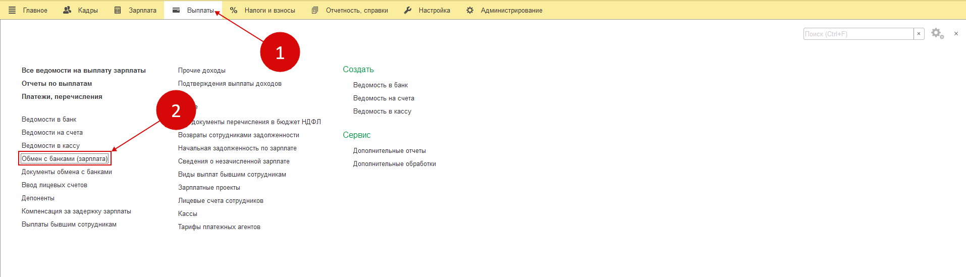• Выберите раздел «Выплата» (1), затем нажмите «Обмен с банками (зарплата)» (2).