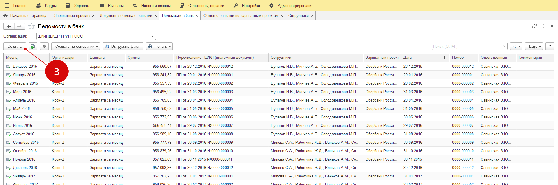 Для того, чтобы перевести заработную плату сотрудникам компании, необходимо создать зарплатную ведомость на выплату для банка.