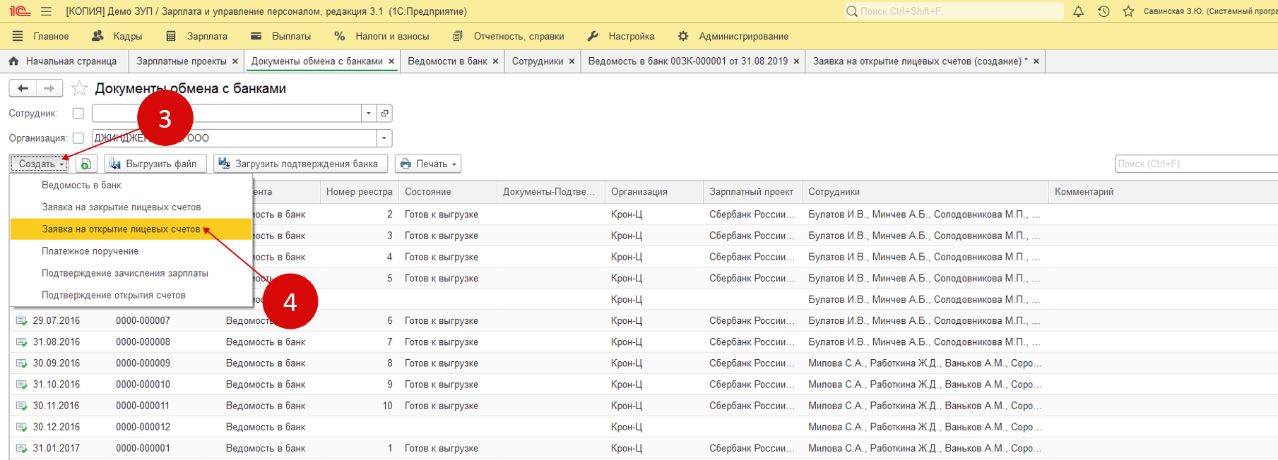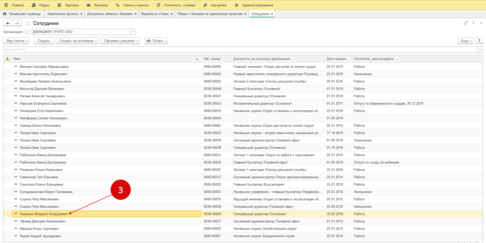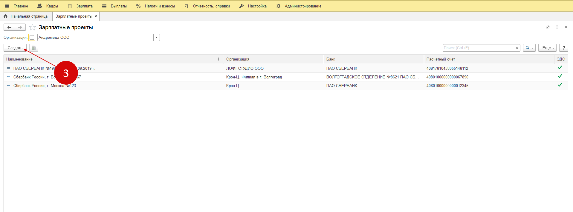 • В появившемся окне выберите зарплатный проект и организацию (3).