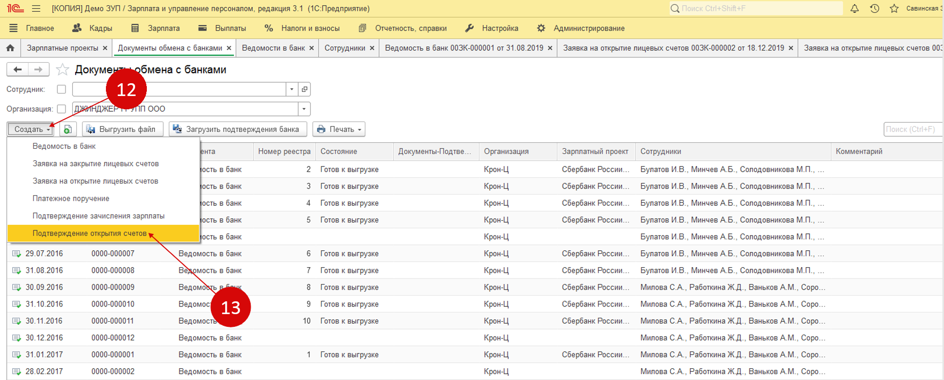 Данные из банка о лицевых счетах новых сотрудников автоматически заполнятся в документе. Подтверждение нужно будет сохранить.