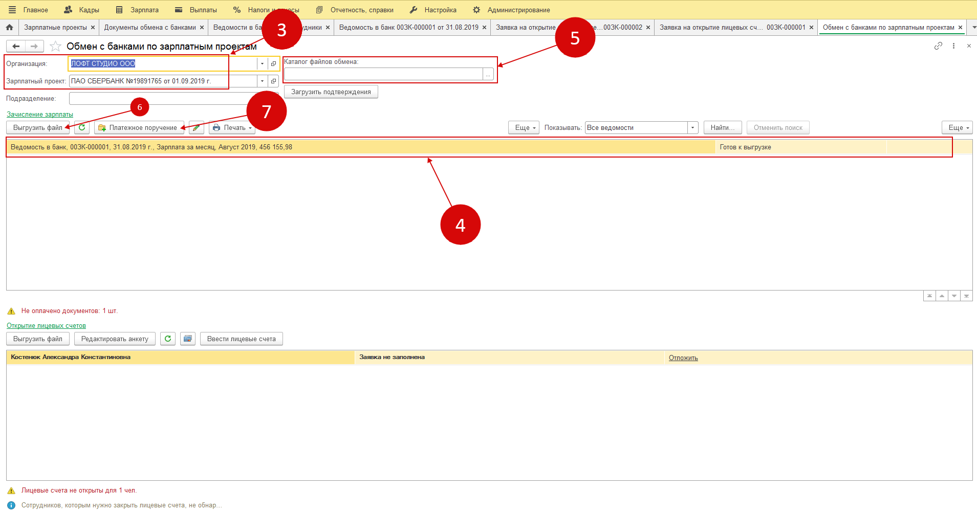 • В нижней части окна отобразятся зарплатные ведомости, сформированные для выгрузки в банк (4).