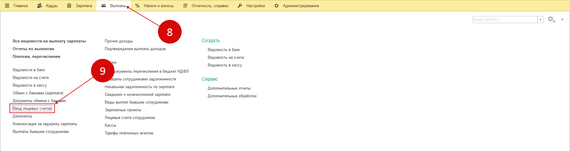 • во вкладке «Сотрудники» (8) появится список всех работников, сведения по лицевым счетам которых отсутствуют;