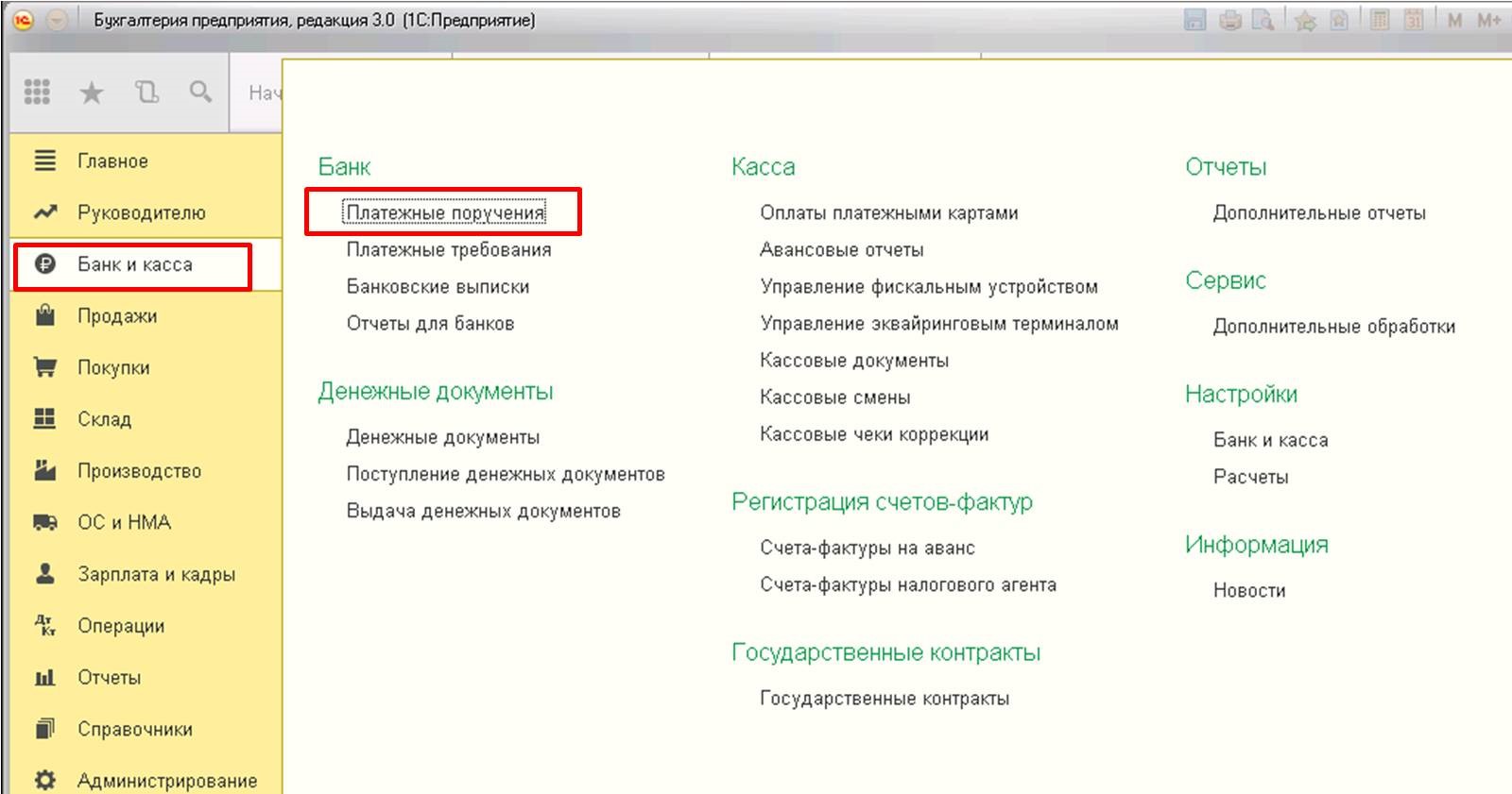 Первое обязательное действие – отправка распоряжения на приобретение валюты в уполномоченный на это банк. Разработка формы такого распоряжения прерогатива специалистов банка и включает в себя: обоснование необходимости покупки валюты, требуемую сумму средств и максимальный курс. Для перевода денег от организации потребуется сформировать платежное поручение. Реализовать это можно на вкладке «Банк и касса»: