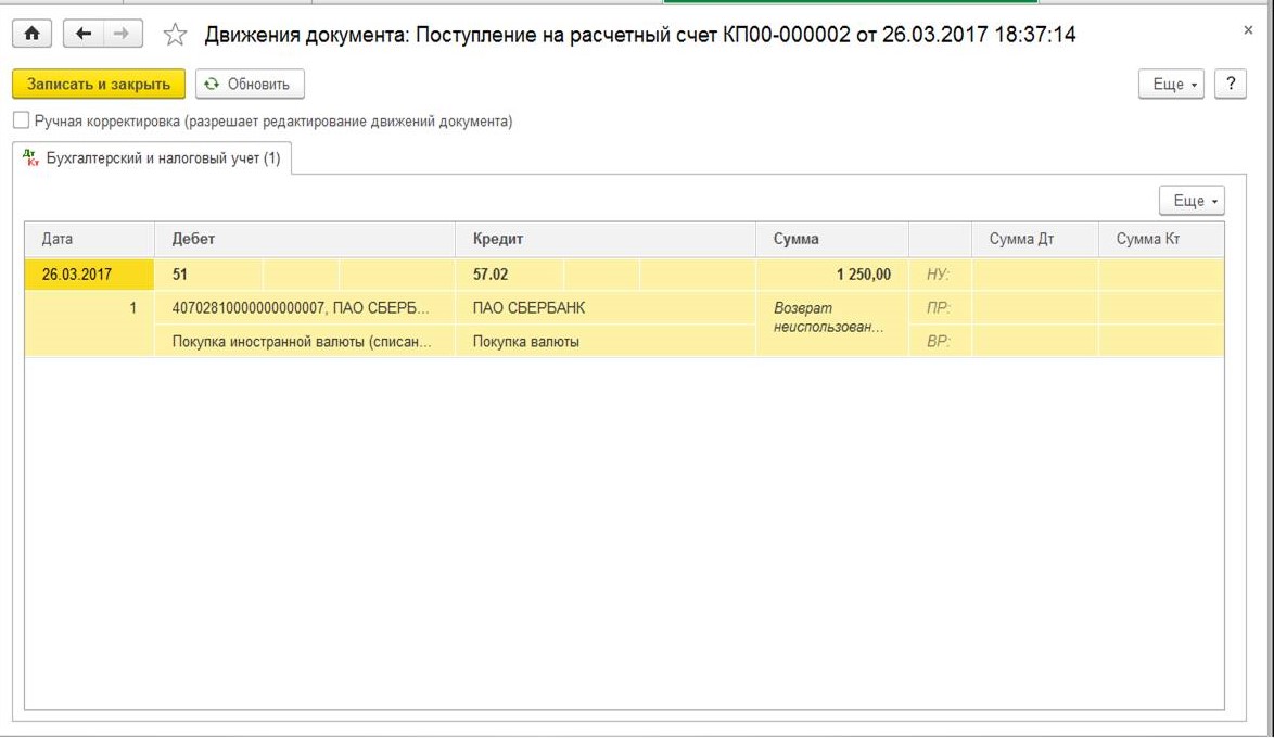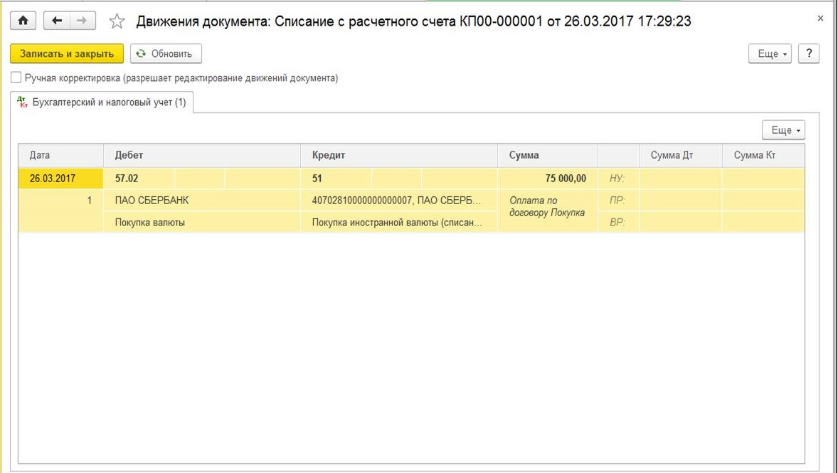 Так как финансы уходят с рублевого счета, вставляем именно его номер в поле «Банковский счет». После программа 1С выдаст отражение транзакции: