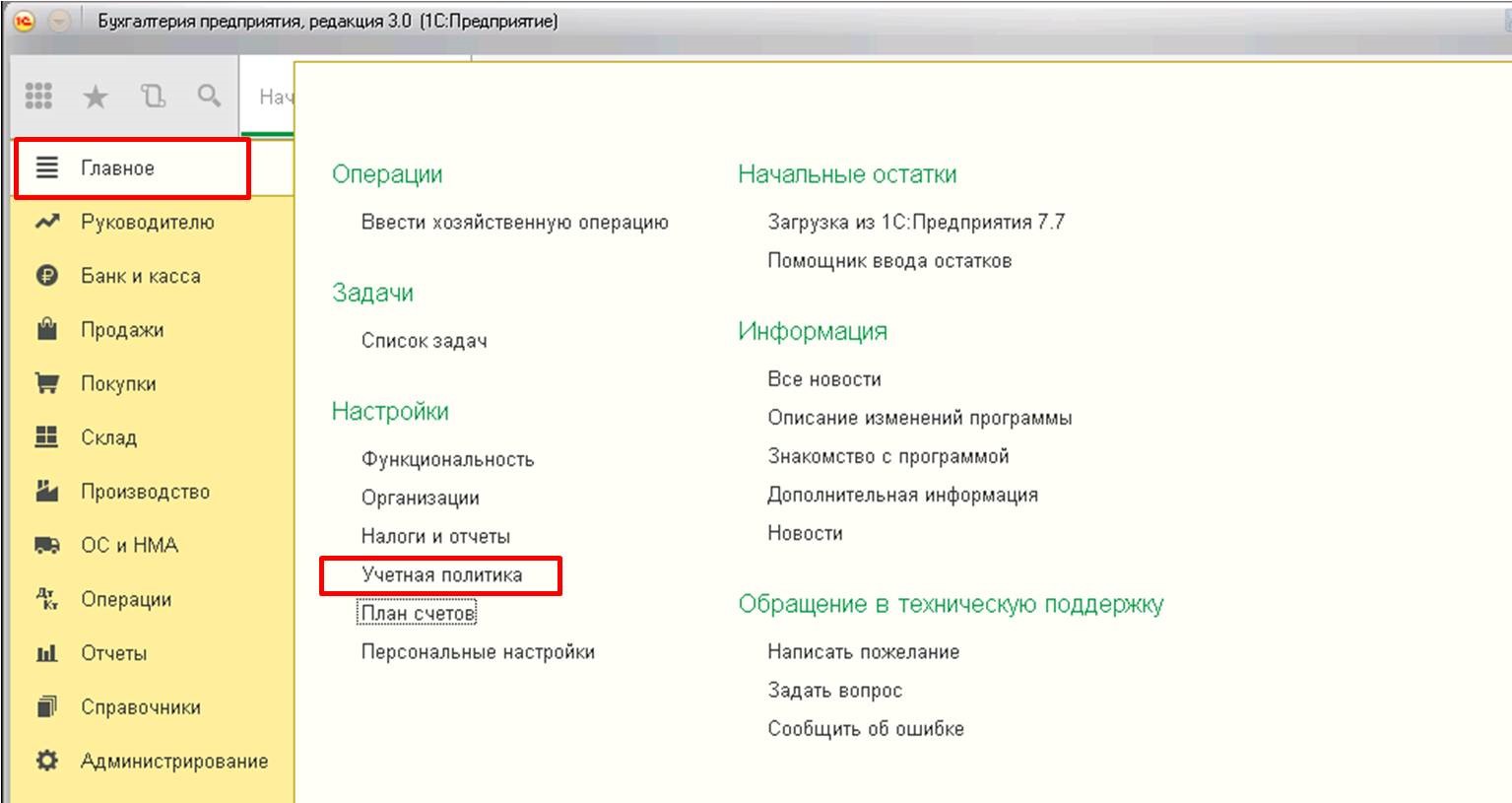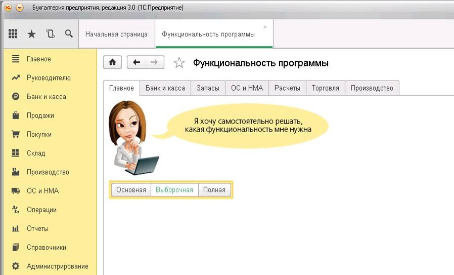 Для нормальной работы данного раздела 1С, потребуется выполнить некоторые подстройки программы. Первым делом включим необходимые нам функции, для чего перейдем в раздел «Администрирование»: