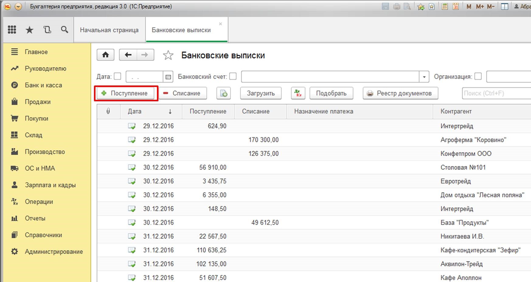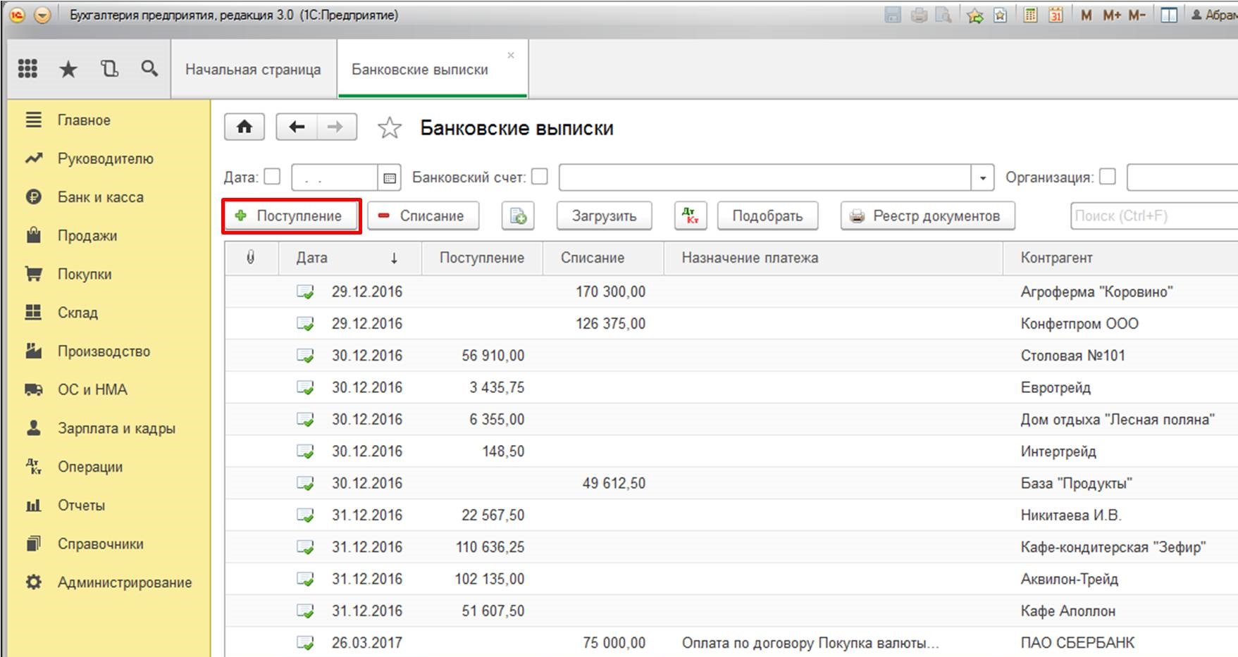 Поскольку перечисление для банка составляло 75 тыс. рублей, а покупка валюты обошлась в 73,75 тыс. рублей, образовавшуюся разницу необходимо возвратить на счет. Для этого нам опять понадобится документ, знакомый по предыдущим шагам, «Поступление на расчетный счет»: