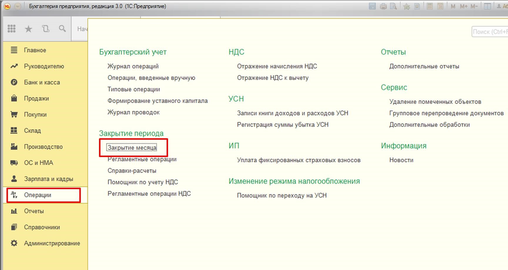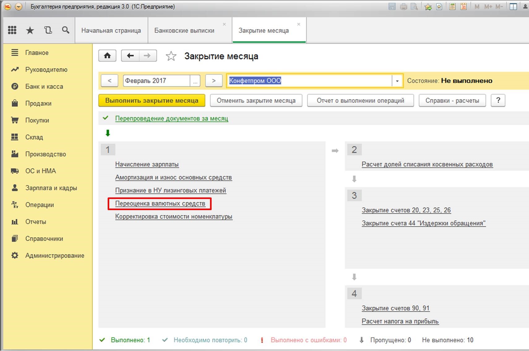 Первую проводку стоит рассмотреть внимательнее. На скриншоте видно, что на балансе организации находилась определенная сумма в валюте, которая также прошла переоценку, с отображением получившейся разницы в курсах (в нашем случае курс несколько снизился, что повлекло убытки). Следует подчеркнуть, что переоценка валюты и обязательств по ней, всегда происходит в случае транзакций и, обязательно, в конце каждого месяца. Для ежемесячной переоценки в программе 1С предусмотрена процедура «Переоценка валютных средств». Ее выполнение происходит в составе пакета «Закрытие месяца»: