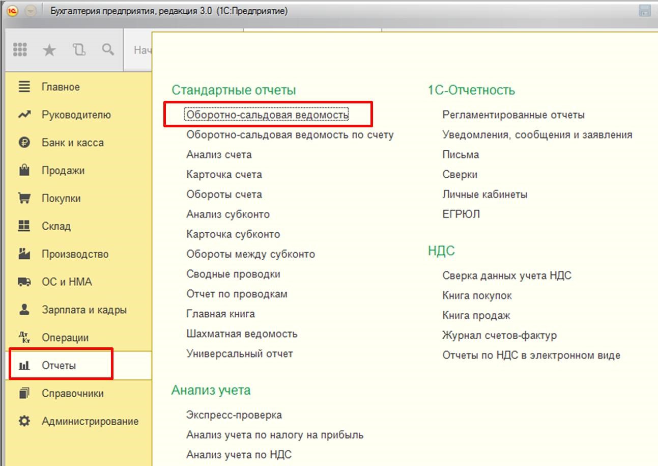 Теперь приобретение валюты в 1С можно считать завершенным. А проверить счета позволит отчетная выборка, для этого в меню потребуется открыть «Оборотно-сальдовая ведомость»: