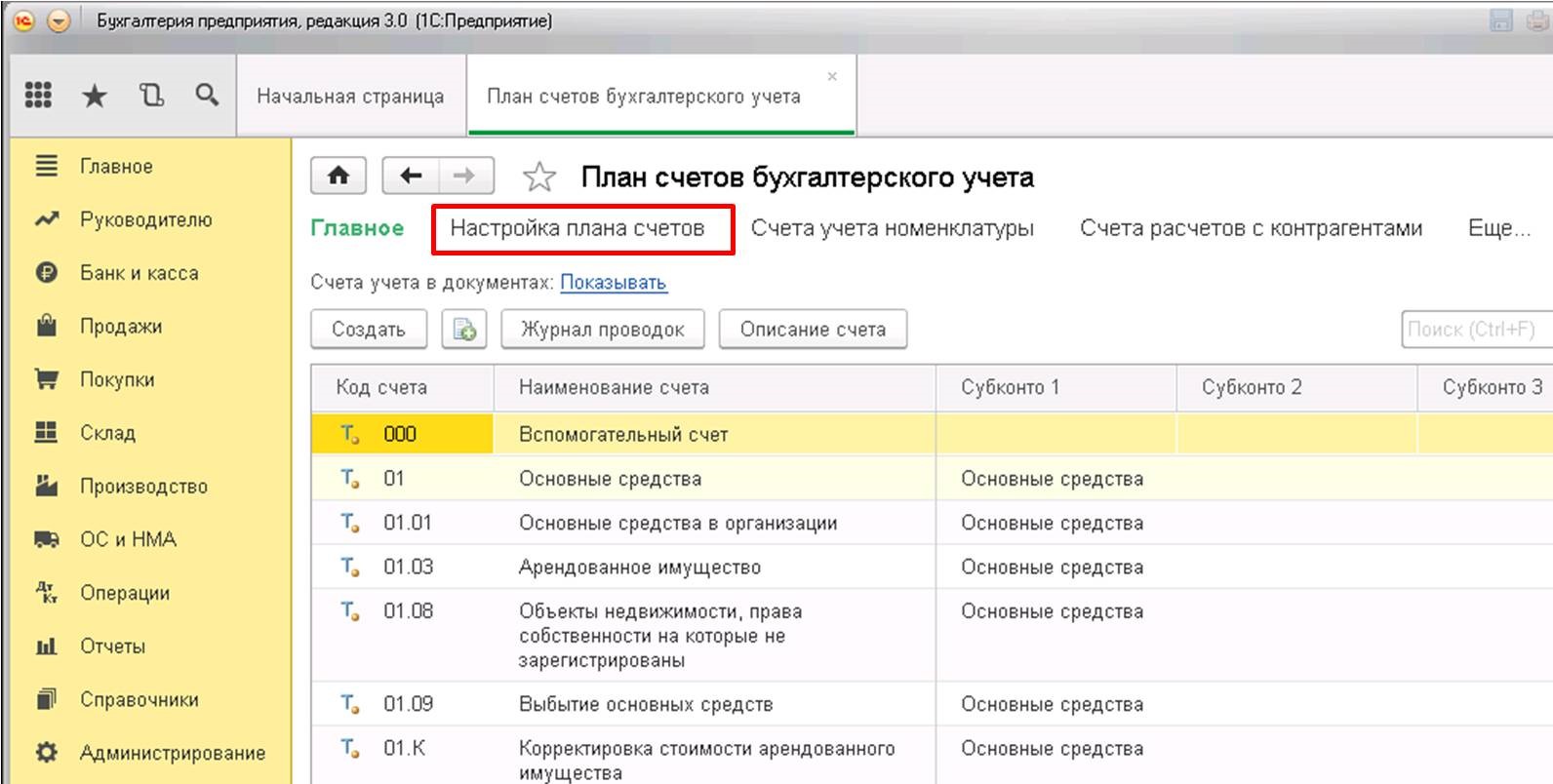 Выполним переход по гиперссылке, для чего жмем «Настройка плана счетов»: